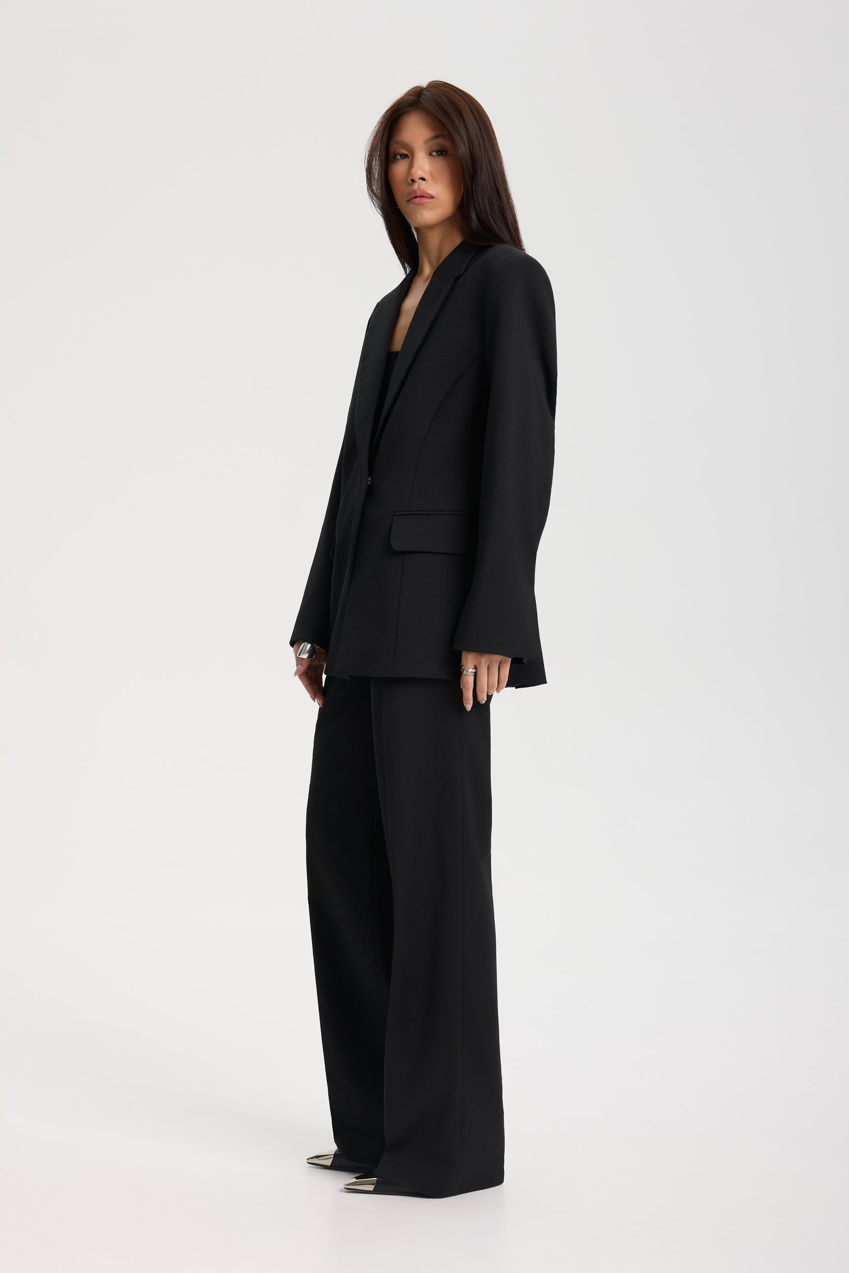 Nawiązania do gorsetowej konstrukcji pojawiają się subtelnie, ale konsekwentnie – od spódniczki z detalami podkreślającymi talię, przez statement piece kolekcji: długą marynarkę z gorsetowymi aplikacjami w postach haftek na plecach, aż po wariację w postaci marynarki o ciętej linii, która reinterpretuje klasykę w nowoczesnym wydaniu. Kulminacją mistrzostwa krawiectwa są spodnie long tailored pants z odpinanym gorsetem - element, który spaja całą kolekcję i czyni ją prawdziwą kapsułą.